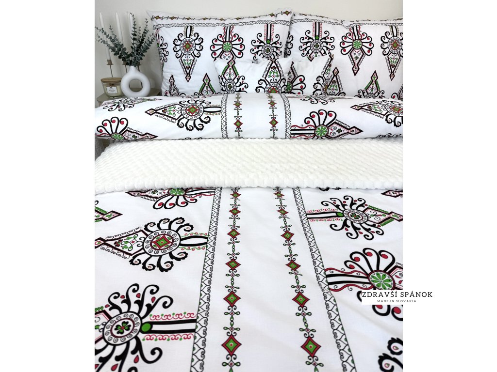 Obliečky Goraľ sú ako stvorené pre každého, kto miluje spojenie tradičného slovenského folklóru s príjemným a kvalitným spánkom. Biely podklad zdobia výrazné ornamenty v červenej, čiernej a zelenej farbe, inšpirované goralskou výšivkou. Tento vzor premení každú spálňu na priestor s dušou – plný tepla, domova a autentickej atmosféry.