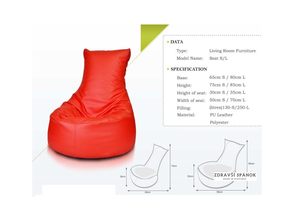 Rozmery: Šírka - 80cm, Výška - 85 cm Tvar sedacieho vaku Stolička Materiál sedacieho vaku: Ekokoža, Polyester Objem sedacieho vaku: 250 litrov Kreslo Seat L, je skutočným elegánom, ktorý nie je možné prehliadnuť a ešte dlho ostane v pamäti. Zaručujeme jeho skvelé využitie po každej stránke. Moderný a zároveň klasický vzhľad spôsobuje, že sa na ňom sedí ako v tradičnom kresle s opierkou, lenže s veľkým rozdielom, a to, že toto kreslo sa prispôsobí osobe, ktorá na ňom sedí a nie opačne, čo je jeho neoceniteľnou výhodou. Za svoje výnimočné vlastnosti vďačí predovšetkým novému tvaru a klasickej výplni v podobe miliárd polystyrénových guľôčok, ktoré osobe sediacej na tomto kresle poskytujú pevnú opierku pre plecia a široké, pohodlné a stabilné sedenie. Sedadlo kresla sa nachádza vo výške asi 30 cm, čo je pre kreslá s granulátom dosť vysokým sedením, vďaka čomu sa z neho vstáva a sadá naň veľmi pohodlne. Nám samým ako aj našim testom sa kreslo rýchlo osvedčilo vďaka svojmu peknému dizajnu a neskutočnému pohodliu počas jeho využívania. Kreslo odporúčame všetkým tak pre zábavu, pokojné čítanie, pozeranie televízie či stretnutia s priateľmi. Tento nákup určite neoľutujete, za to ručíme! Toto kreslo vyrobené z ekokože nespôsobuje alergie a je bezpečné pre deti. Určenie Obývačka, spálňa, kancelária, čakáreň, školy relaxačných techník, konferenčno-vzdelávacie centrá, rehabilitačné centrá, pôrodnícke školy, lekárske ambulanciePri výbere farieb sa riaďte vzorkovníkom na obrázku. Materiál: E :Ekokoža E01-E20 NC : Polyester NC01 - NC16
